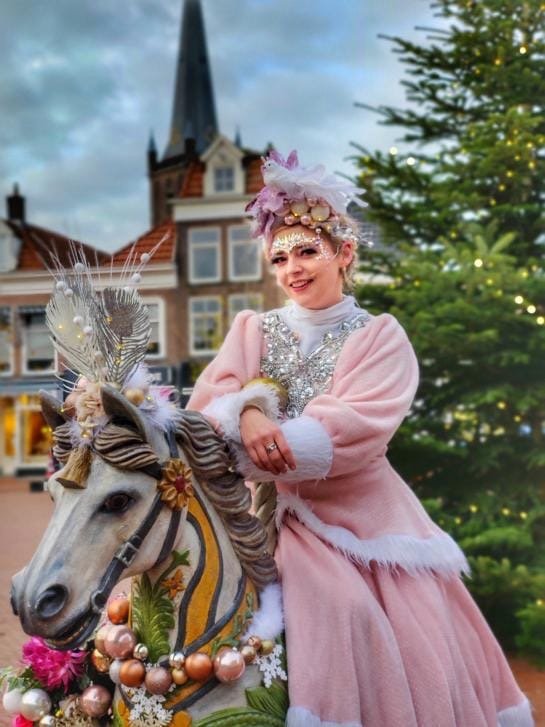 De betoverende Winterprinses rijdt op haar prachtige winterpaardje door het winkelcentrum, terwijl zachte kerstmuziek klinkt. Een sprookjesachtige verschijning die iedereen laat glimlachen!