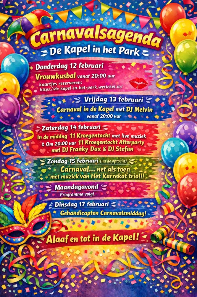- Donderdag 12 februari: Vrouwkusbal, vanaf 20.00 uur. Tickets>> - Vrijdag 13 februari: DJ Melvin, vanaf 20.00 uur. - Zaterdag 14 februari: In de middag 11 Kroegentocht met live muziek van Marco de Hollander om 15.30 uur en vanaf 20.00 uur Officiële 11 Kroegentocht Afterparty met DJ Franky Dux en DJ Stefan. - Zondag 15 februari: Na de start van de optocht Net als toen met Het Karrekot Trio. - Maandag 16 februari: Programma volgt - Dinsdag 17 februari: Gehandicaptenmiddag