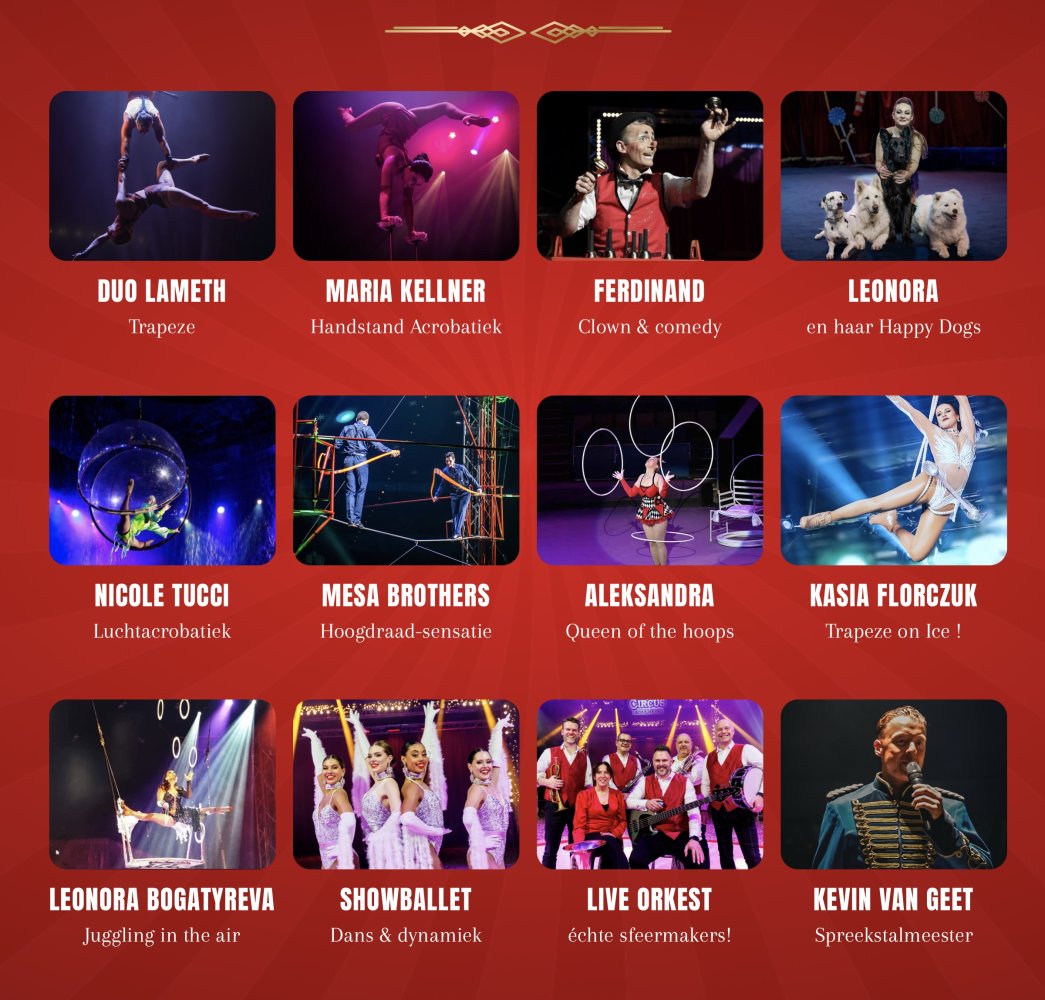 Verheug jezelf alvast op internationale sterren uit de circuswereld. Acrobaten in de nok van de tent, jongleurs op aanraakbare afstand en vertederende dieren, afgewisseld door comedyclown en begeleid door het groot, live circusorkest.