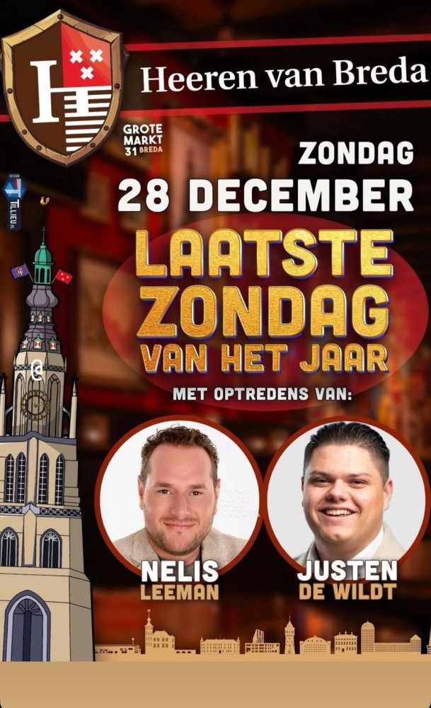 Zondag 28 december sluiten we het jaar feestelijk af! Met optredens van Nelis Leemans en Justen de Wildt. Dus kom ook gezellig naar de Grote Markt 31.
