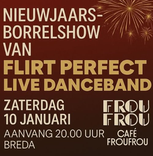 Vier het nieuwe jaar tijdens de Nieuwjaarsborrelshow van Flirt Perfect Live Danceband. Een gezellige avond met live muziek en volop gelegenheid om te dansen.