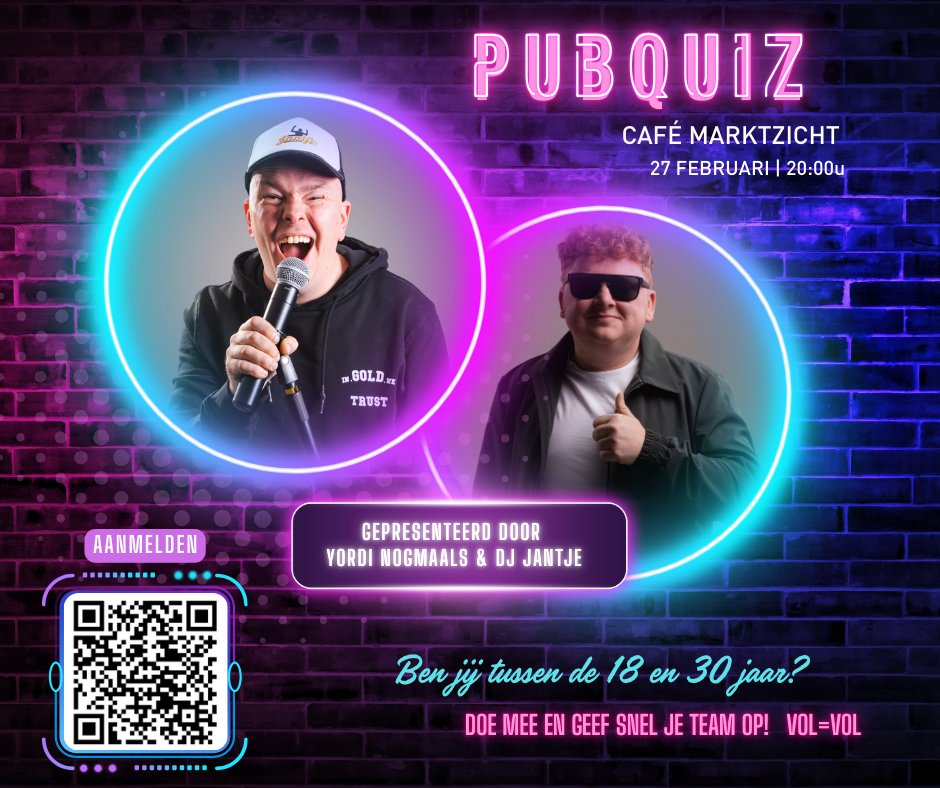 Ben jij tussen de 18 en 30 jaar? Weet jouw team alles over muziek, films, nieuws en een beetje over Etten-Leur? Geef je team dan snel op voor de pubquiz in Café Marktzicht. Er zijn toffe prijzen te winnen!