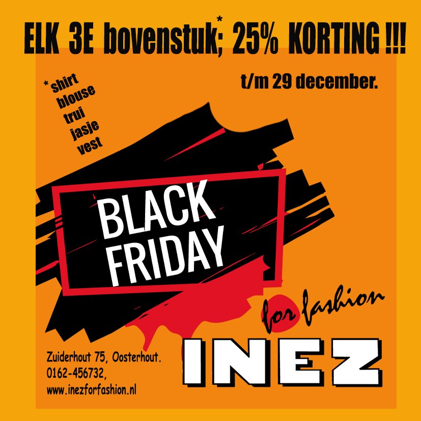 Bij Inez for fashion krijg je tot en met zaterdag 29 november 25% korting op elk 3e bovenstuk. Shirts, blouses, truien, jasjes en vesten doen allemaal mee.