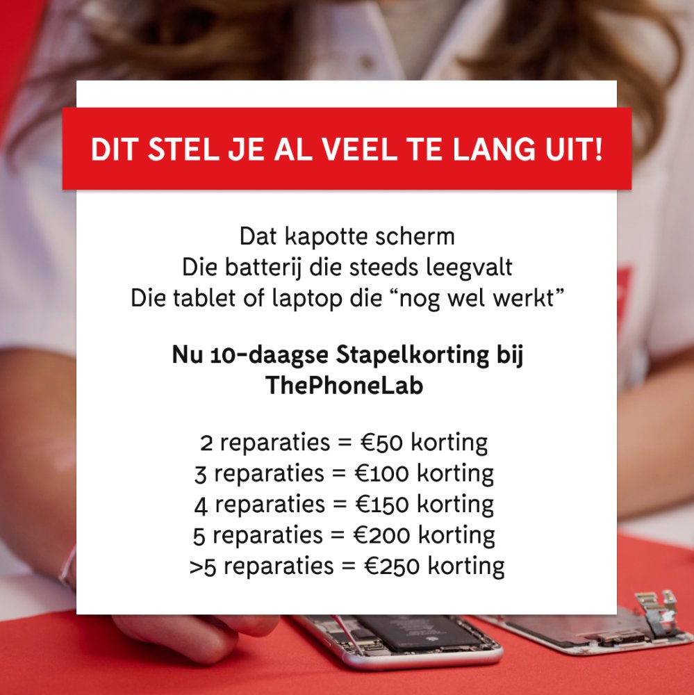 10-daagse Stapelkorting 29 januari - 31 januari The Phone Lab Breda Tot 1 februari stapelkorting bij ThePhoneLab Lees verder 10-daagse stapelkorting bij ThePhoneLab 2 reparaties = €50 korting3 reparaties = €100 korting4 reparaties = €150 korting5 reparaties = €200 korting>5 reparaties = €250 kortingJe telt alle reparaties bij elkaar op. Dat mag op één device zijn, op meerdere devices, ofeen combinatie daarvan.Het totaal bepaalt je korting.Breng alles wat kapot is in één keer langs en pak tot €250 voordeel. Wilhelminastraat 1, Breda