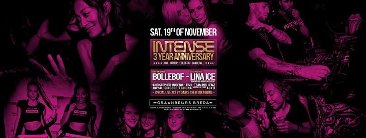 YESSS! INTENSE is nu al 3 JAAR!!! met spetterende edities in de stad waar het allemaal begon en dat gaan we GROOTS met jullie vieren in de Graanbeurs Breda! We hebben daarom niemand minder dan BOLLEBOF uitgenodigd voor een heerlijke liveshow! Met clubbangers als "KWASTEN" "BUNDA" en zijn nieuwste hit "GIRLFRIEND" ga jij met je crew sowieso los!