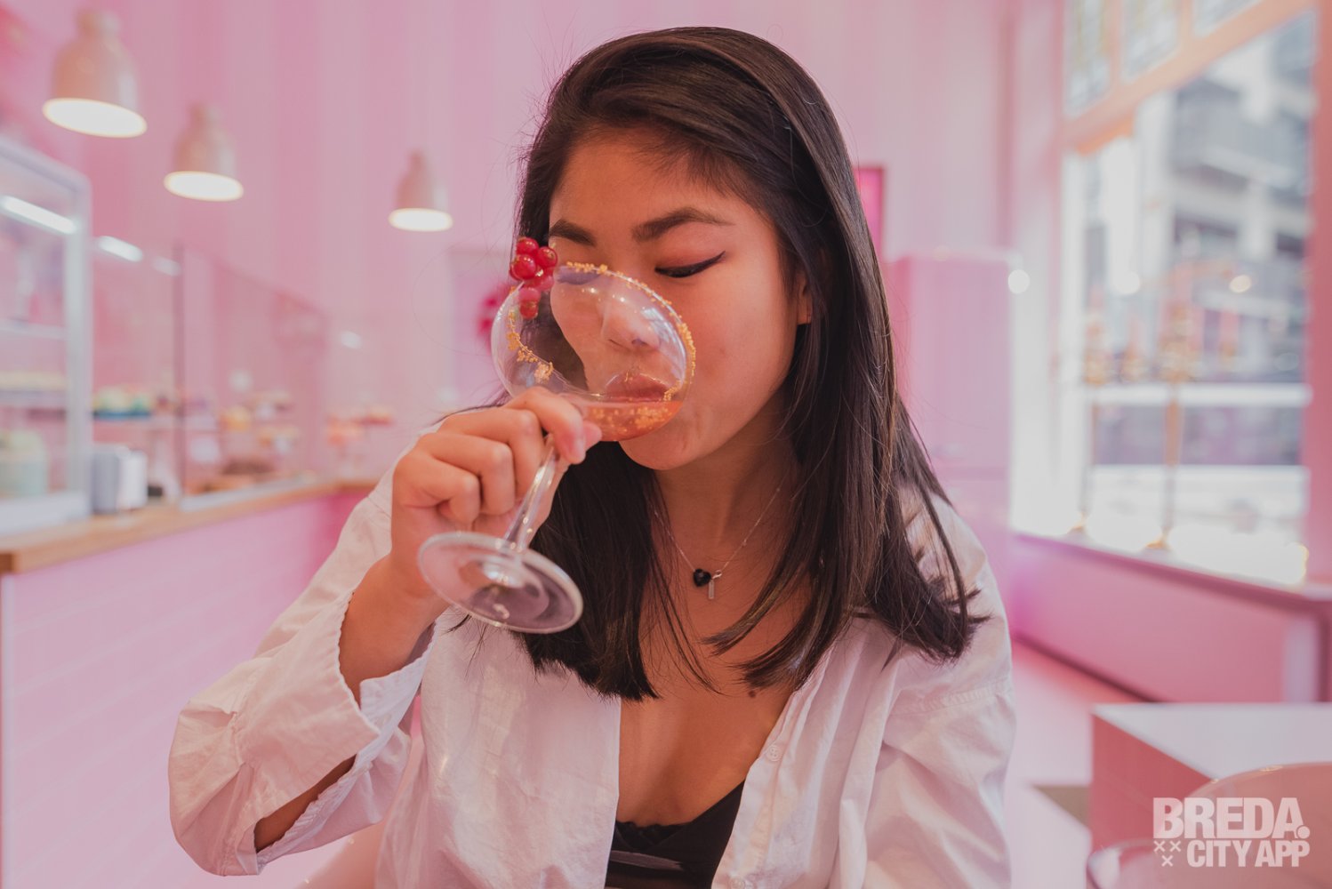 We worden bij binnenkomst vriendelijk ontvangen door de medewerkers van a Cup of Cake en we krijgen een mooi plekje naast de kerstboom. De thee staat al klaar terwijl de voorbereidingen voor de Christmas High Tea getroffen worden. We beginnen met een lekker welkomstdrankje, dat gemaakt is van eigengemaakte limonade. Het cocktailglas is versierd met gouden sprinkels en rode besjes wat zorgt voor een feestelijke uitstraling. De limonade is precies goed gezoet, waardoor de smaak niet overheersend is.