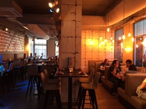 De zaak heeft een hippe en warme uitstraling gekregen, met veel gezellig zitjes om te loungen. Het is een mooie combinatie van oosterse en westerse invloeden geworden. Opvallend is dat de zaak voor naar achteren steeds donkerder wordt. Helemaal achterin heerst er daardoor een intiemere sfeer. De sfeer kan ook sterk worden bepaald door de verschillende led wanden. De wand voorin bestaat uit een soort schubben die licht doorlaten, “de eerste in Nederland” volgens Jun.