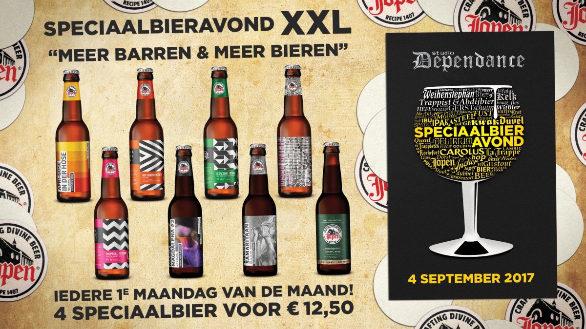 Daarnaast wordt de Speciaalbieravond dit  keer naar een hoger niveau gebracht door  middel van een exclusieve brouwerij van de maandproeverij. Tijdens deze speciale  begeleide proeverij kan een select gezelschap kennis maken met de nieuwe  bieren,  inclusief hapjes en uiteraard extra uitleg over de bieren en de brouwerij. Ben jij die  bierliefhebber die iedere maand als eerste alle nieuwe bieren geproefd wil hebben?  Meld je dan snel aan via de Facebookpagina van Studio Dependance, want er zijn  nog slechts enkele plaatsen beschikbaar in de voorinschrijving.