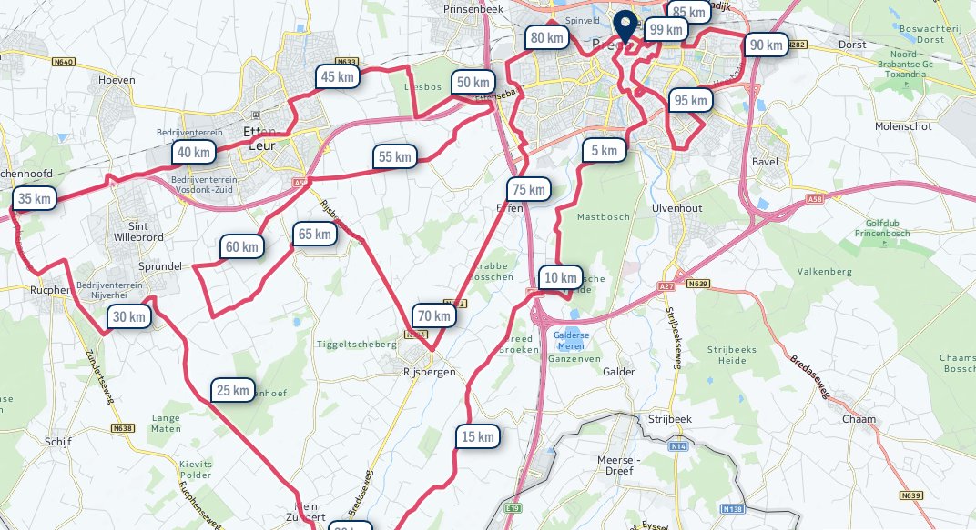 De route start aan de haven in Breda en loop dan door verschillende plekken in Brabant. In totaal is het parcours 100km, een finish die waarschijnlijk niemand zal halen. Na een bepaald tijdstip gaan er namelijk volgwagens rijden. Als deze je inhalen ben je "af". Je moet dus proberen om zo snel mogelijk, zo ver mogelijk te komen. Bekijk onderstaande de route.