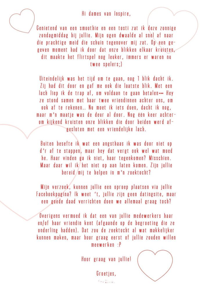 Breda Nieuws Scoops Love is in the air Delen Facebook Twitter Google+ Love is in the air Geplaatst op 26 maart 2015 De zomertijd gaat bijna in en dan krijgen we natuurlijk weer lentekriebels... Bij Inspire Coffee was dat al goed te merken, ze kregen namelijk onderstaande brief van een gast. Help deze jongen en deel het bericht! #LoveIsInTheAir