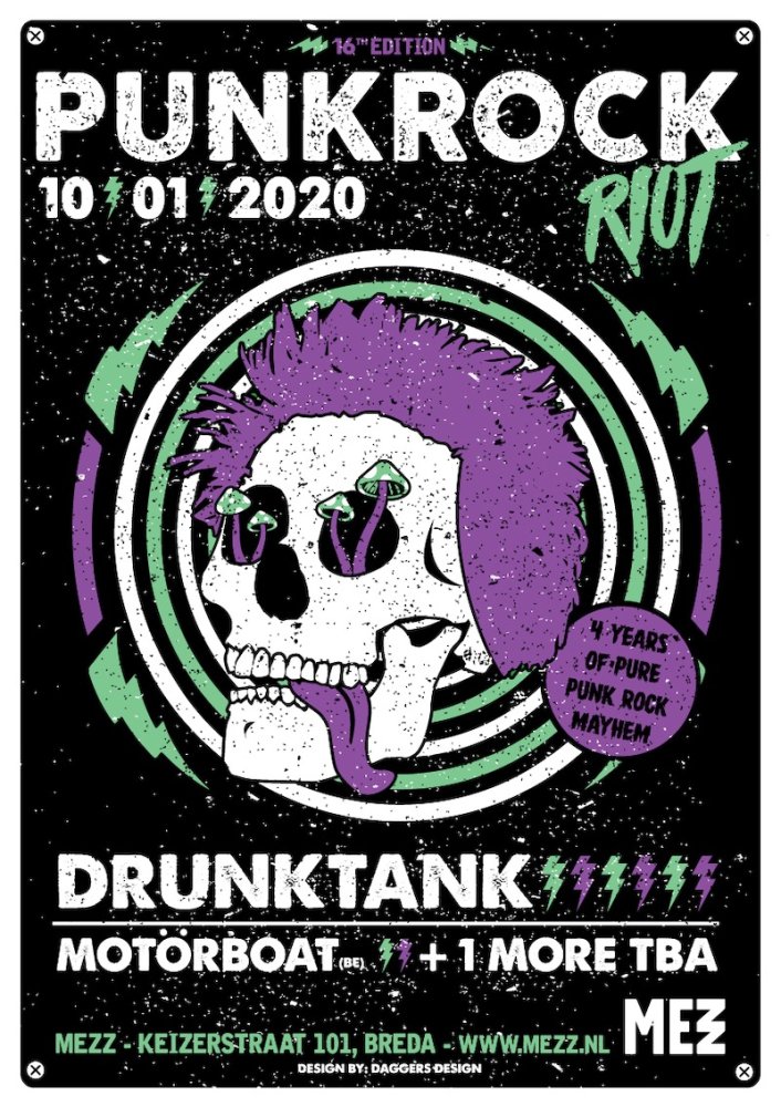 Dit jaar bestaat Punkrock Riot vier jaar en dat vieren we samen met Drunktank, Motörboat en Yesterday’s News! Drunktank brengt snelle, melodieuze, sing-a-long skatepunk met een dikke hint naar de jaren ’90 naar Mezz. Ook de diverse band Motörboat en poppunk- en punkrockband Yesterday’s News komen voorbij!