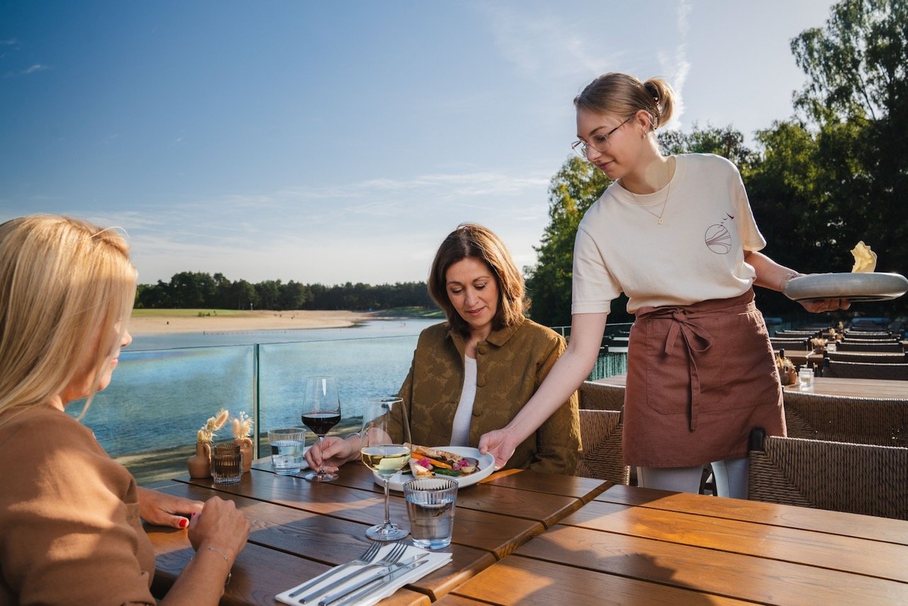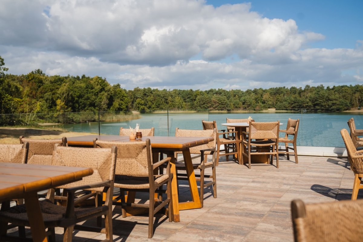 Binnen biedt het restaurant ruimte aan 100 gasten, terwijl het ruime terras met 120 zitplaatsen uitzicht biedt over het water, de perfecte plek om te ontspannen in de natuur.